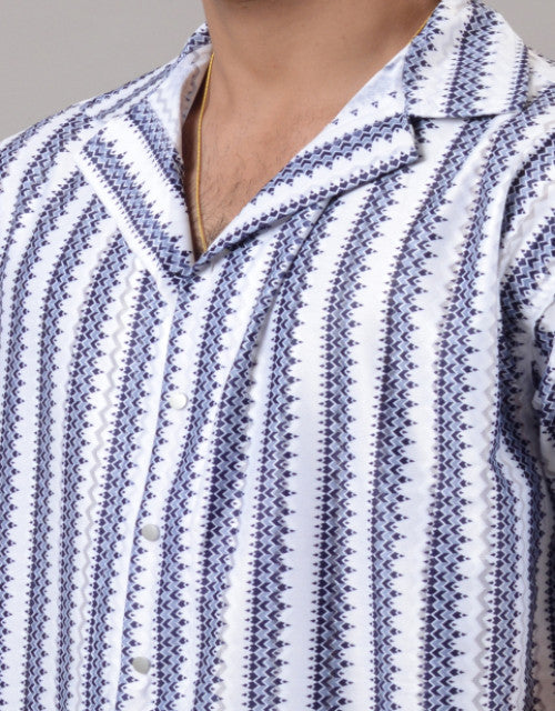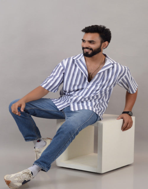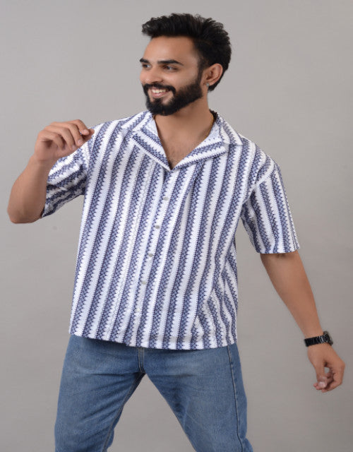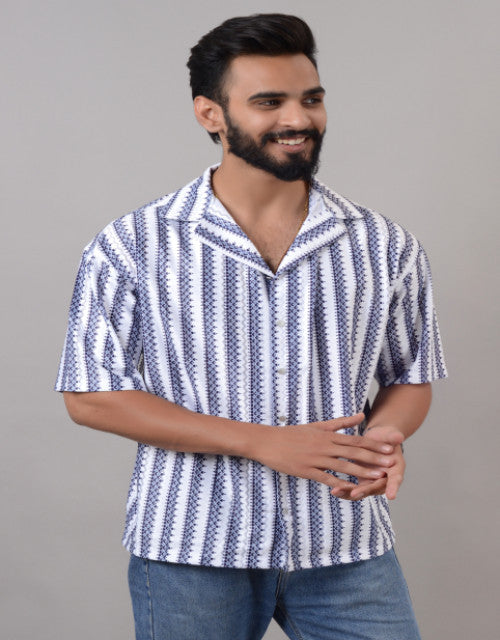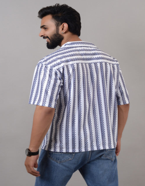 Men Blue Cotton Blend Striped Spread Collar Half Sleeves Oversized Casual Shirt (SIZE- M,L,XL)